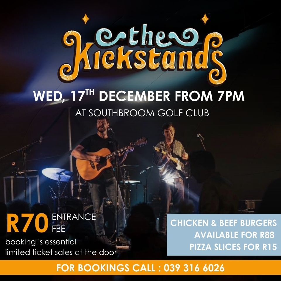 The Kickststands are taking the stage at Southbroom Golf Club — the perfect way to 'kick' off the festive season! Wednesday, 17th December at 7pm Entrance: R70 Bookings essential (with only limited tickets available at the door) Chicken & Beef burgers available for R88 Pizza by the Slices for R15 per slice Don’t […] |