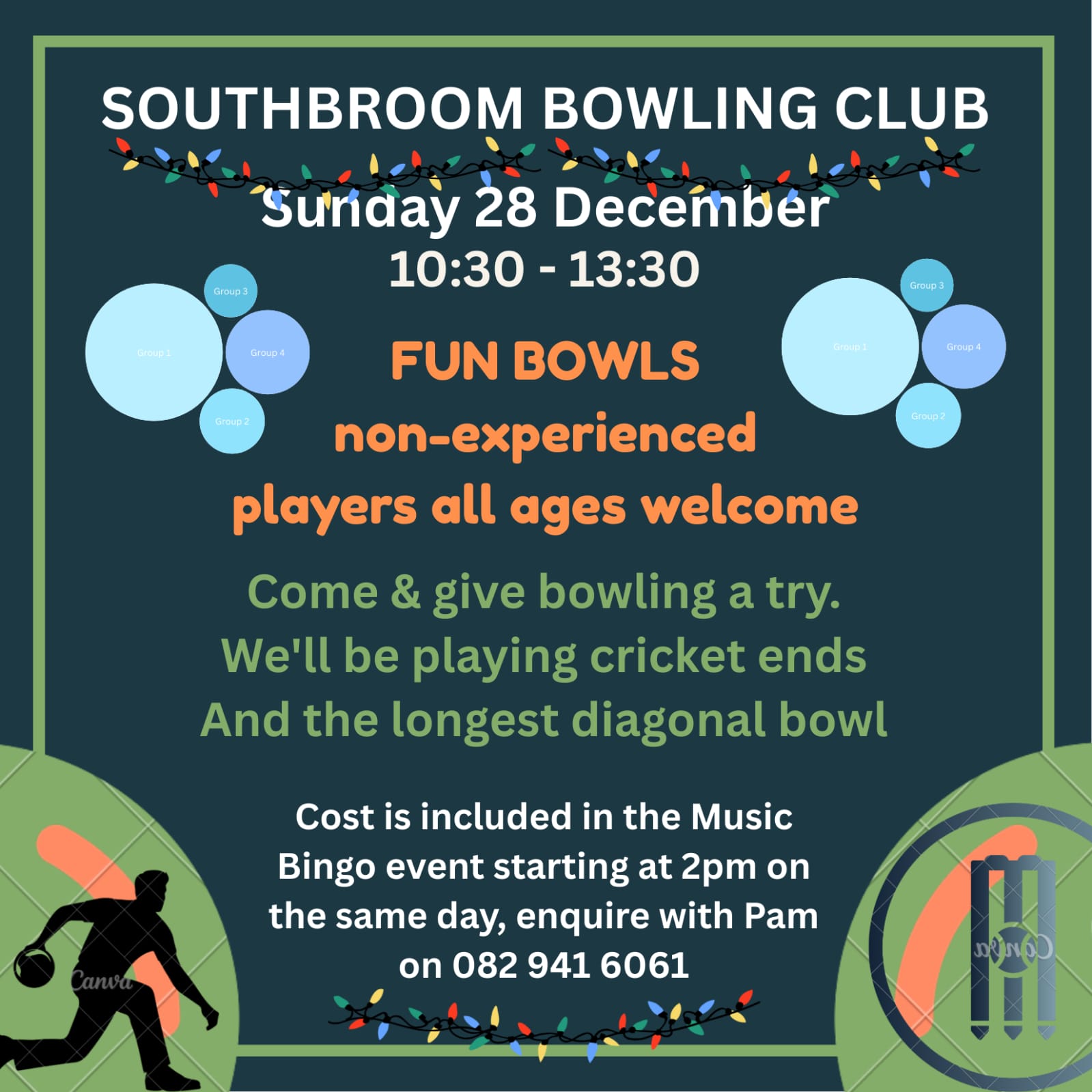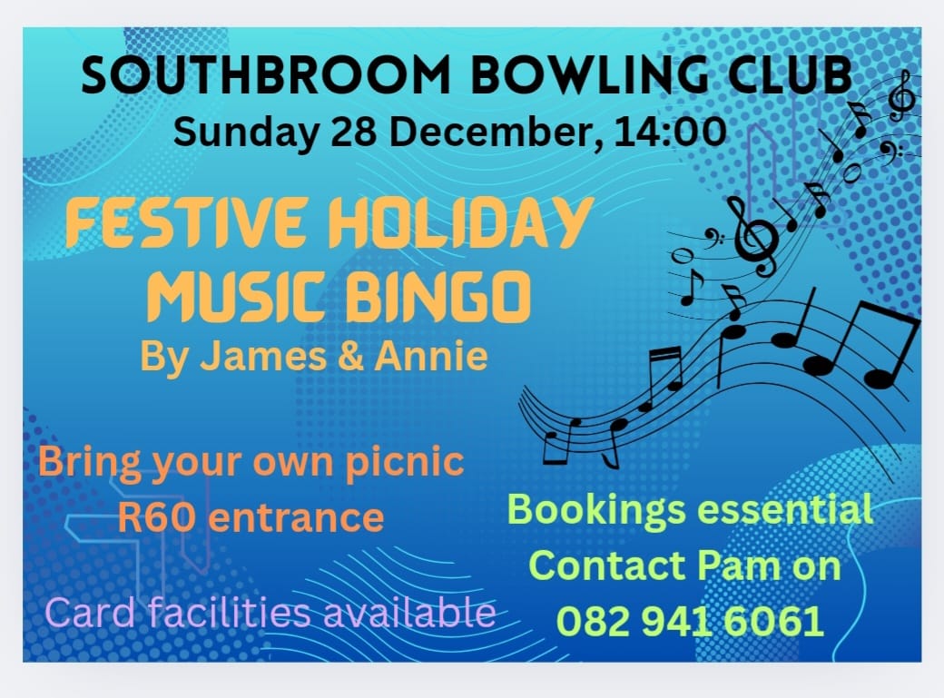 Festive Holiday Musical Bingo at Southbroom Bowling Club with James & Annie. 28th December 2025 from 2pm R60 per person Bring your own your Picnic Basket. Booking Essential contact Pam on 0829416061 |