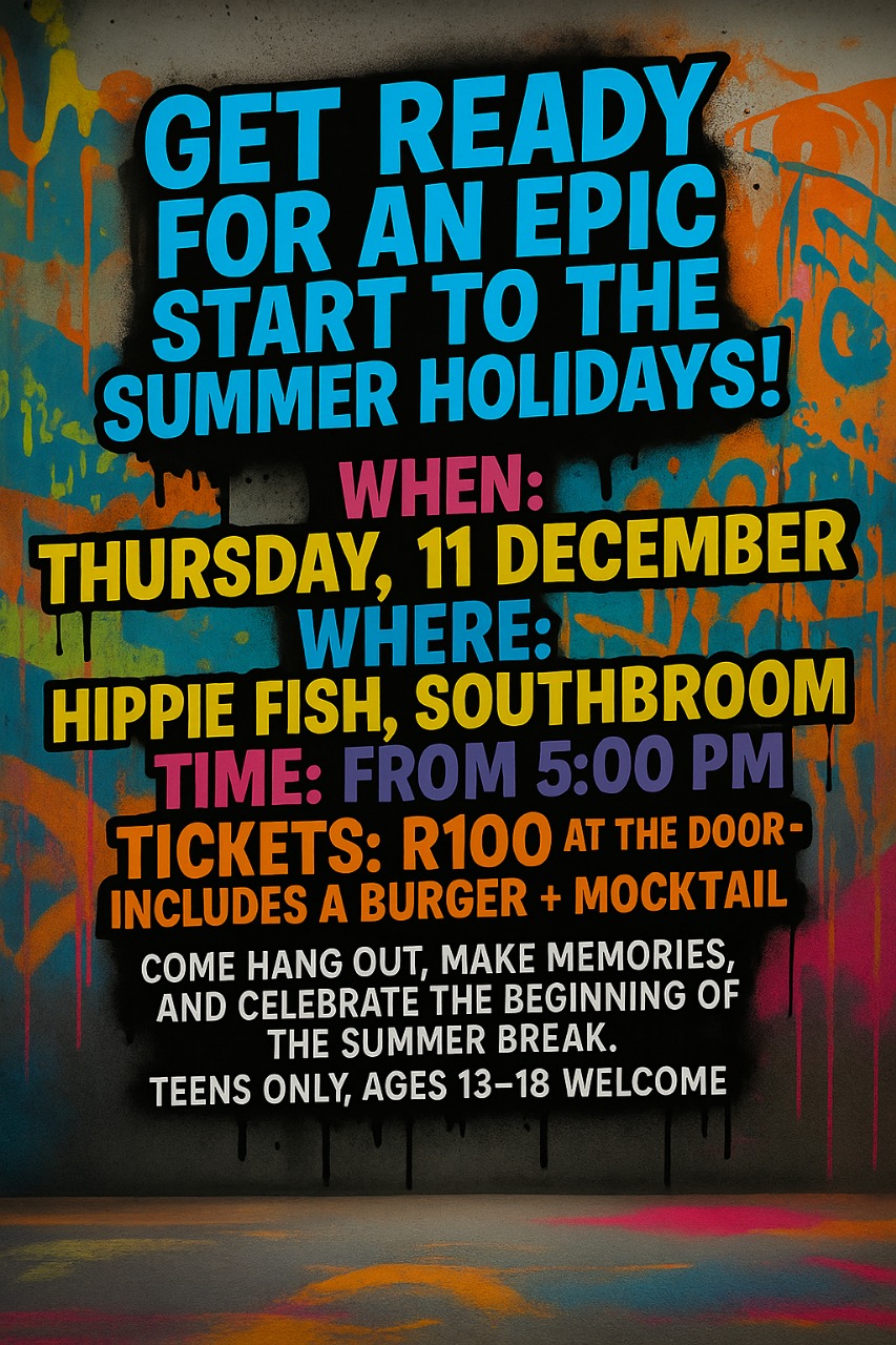 Get Ready for an EPIC start to the SUMMER Holiday's! Thursday, 11th December from 5pm 13 years to 18 years ONLY Tickets: R100 per person which includes a Burger & a Mocktail Get your Tickets at the Door. |