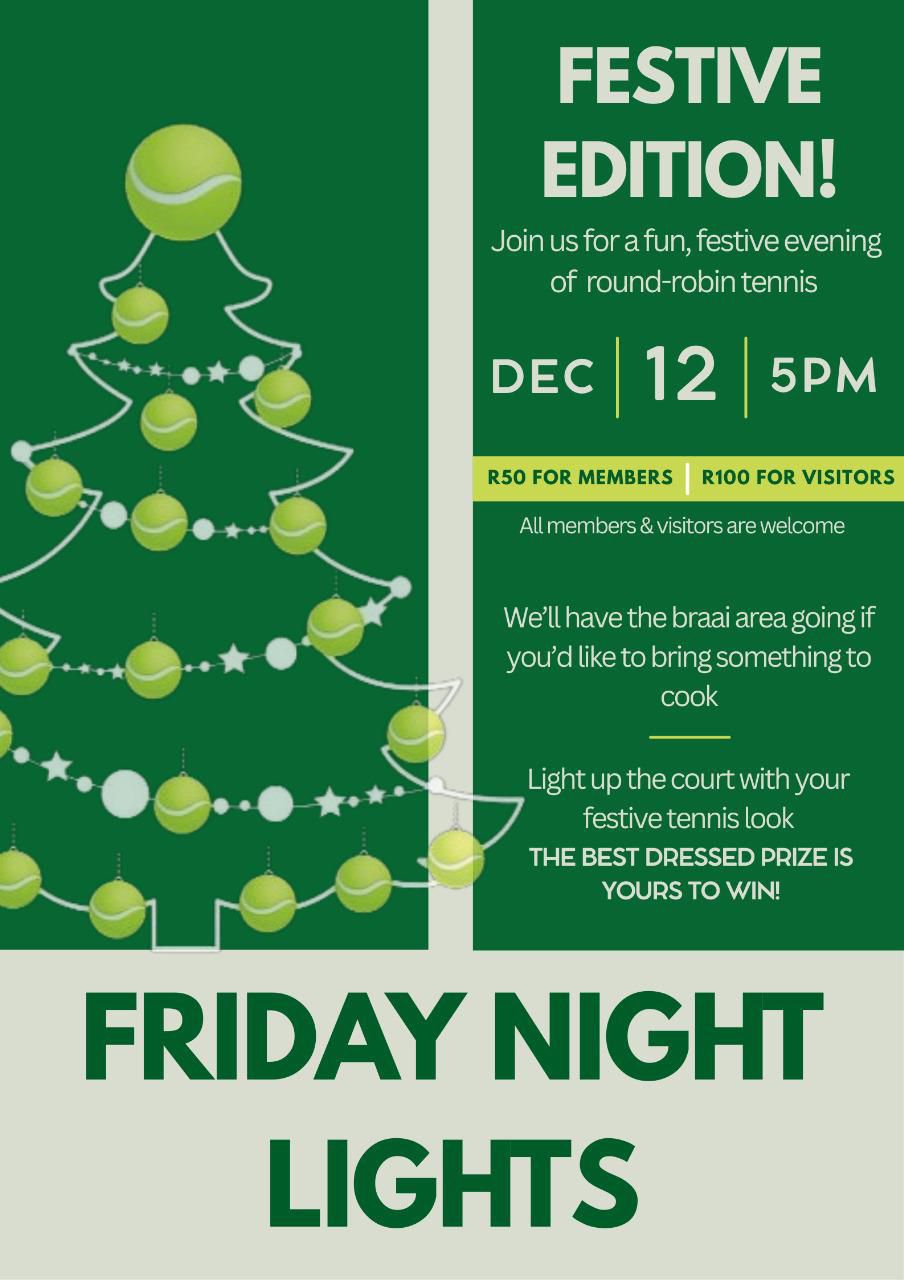 Friday Night Lights at Southbroom Tennis Club A fun, festive evening of round-robin tennis 🎾🎾 All members & visitors are welcome R50 for Members R100 for Visitors Light up the court with your festive tennis look…best dressed prize up for grabs 🎄 |