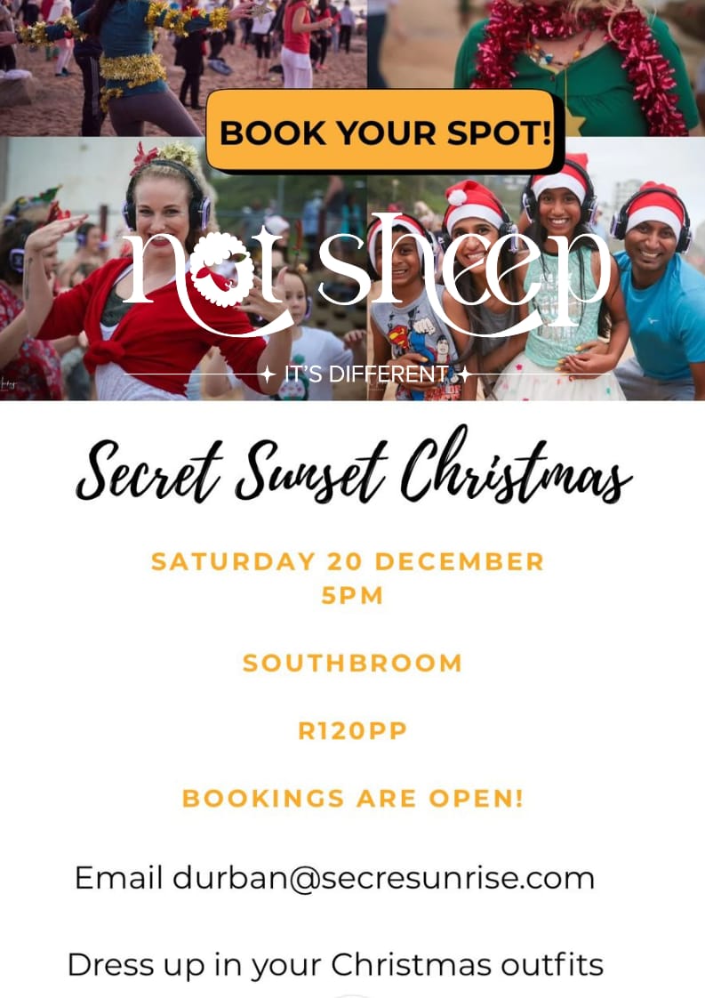 Secret Sunset Christmas EDITION in Southbroom with Not Sheep. Secret Sunrise is a global community aiming to unite the world through music, movement and connection. Book your Tickets now to Join the silent Disco Christmas dance with Not Sheep. Email - durban@secretsunrise.com - to make your Booking today. |
