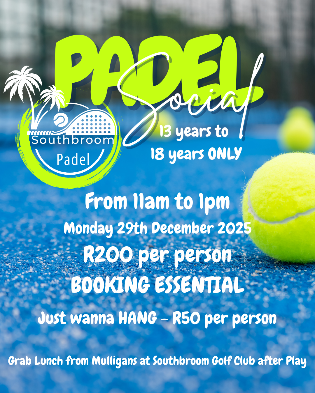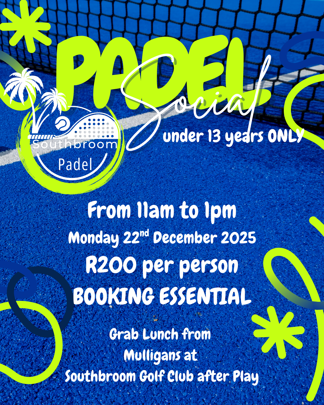 🌟 Padel Social @ Southbroom Padel 🌟 Get ready for fun, sun, and great padel vibes! Calling all young players between 13 years & 18 years to join us for a morning of Padel ACTION. 🎾 Date: Monday the 29th December 2025 🎾 Time: 11am to 1pm 🎾 Venue: Southbroom Padel Club 🎾 […] |